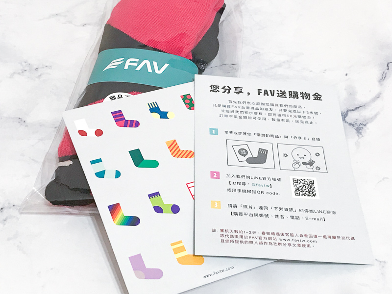 有著多彩襪子圖樣的那張,背面是FAV的品牌簡介和洗滌說明;另一張則是FAV的分享卡,只要拿著這張卡,跟購買的襪子自拍一張,再把照片回傳給客服,就可以拿到50元購物金唷 XD