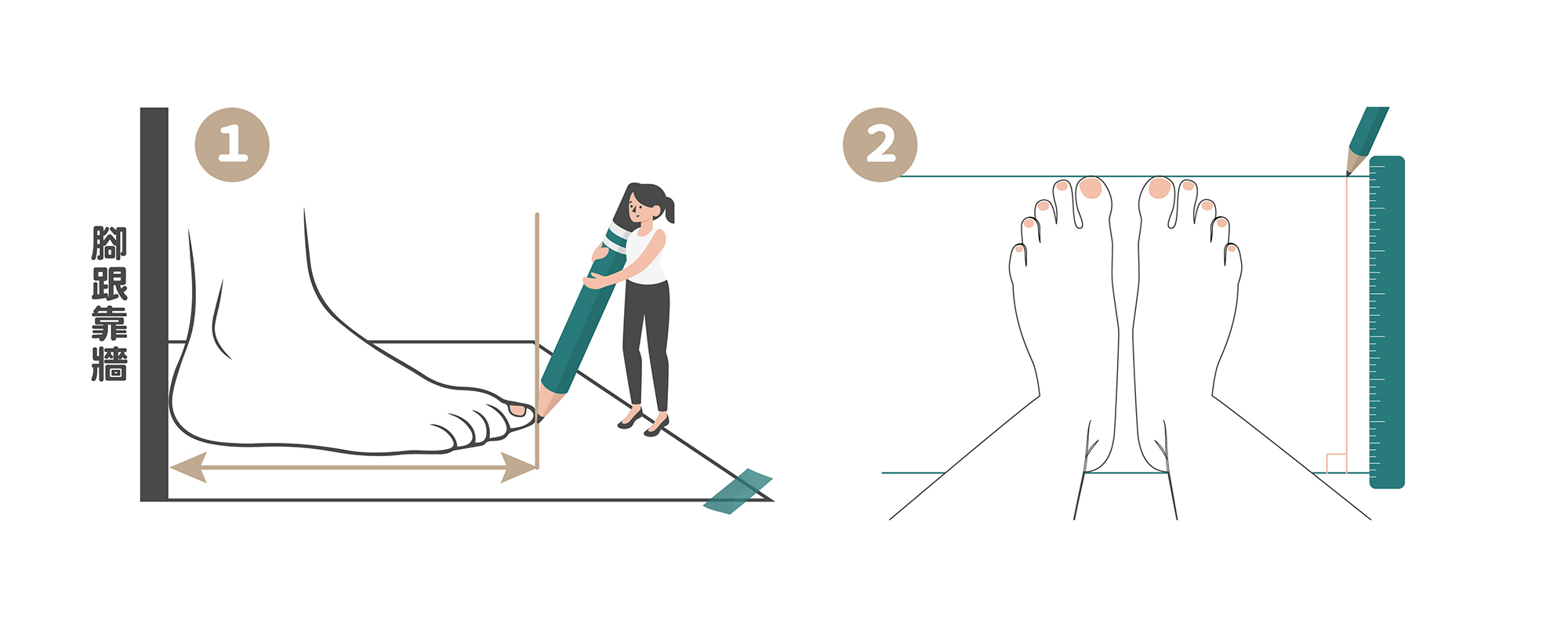準備一個捲尺,在紙上量出腳寬最寬的部分,以及腳長最長的公分數,記錄下來,這樣就能快速知道腳的大小。