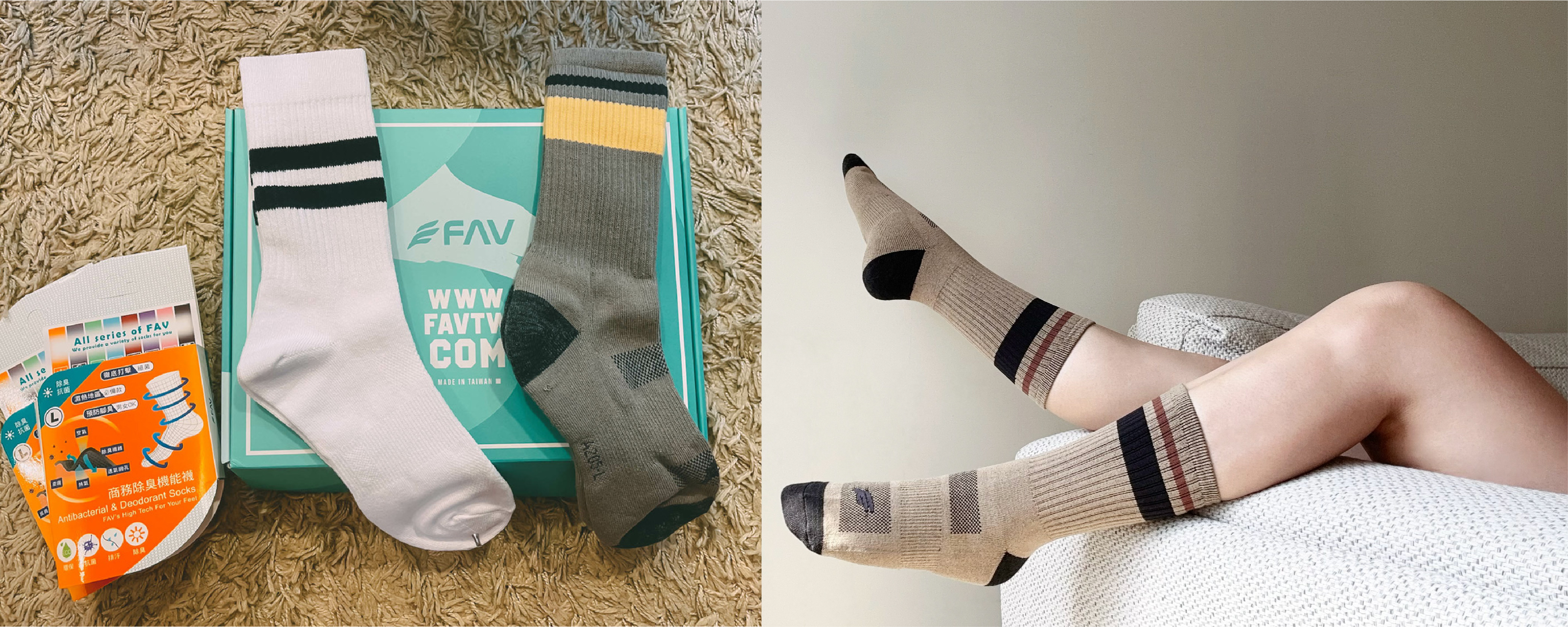 FAV飛爾美設計的除臭襪會在襪子的布料裡添加除臭紗的材質,如竹炭、石墨烯、銀離子等等,增加襪子的除臭抑菌效果,更能幫助雙腳的乾爽消臭。