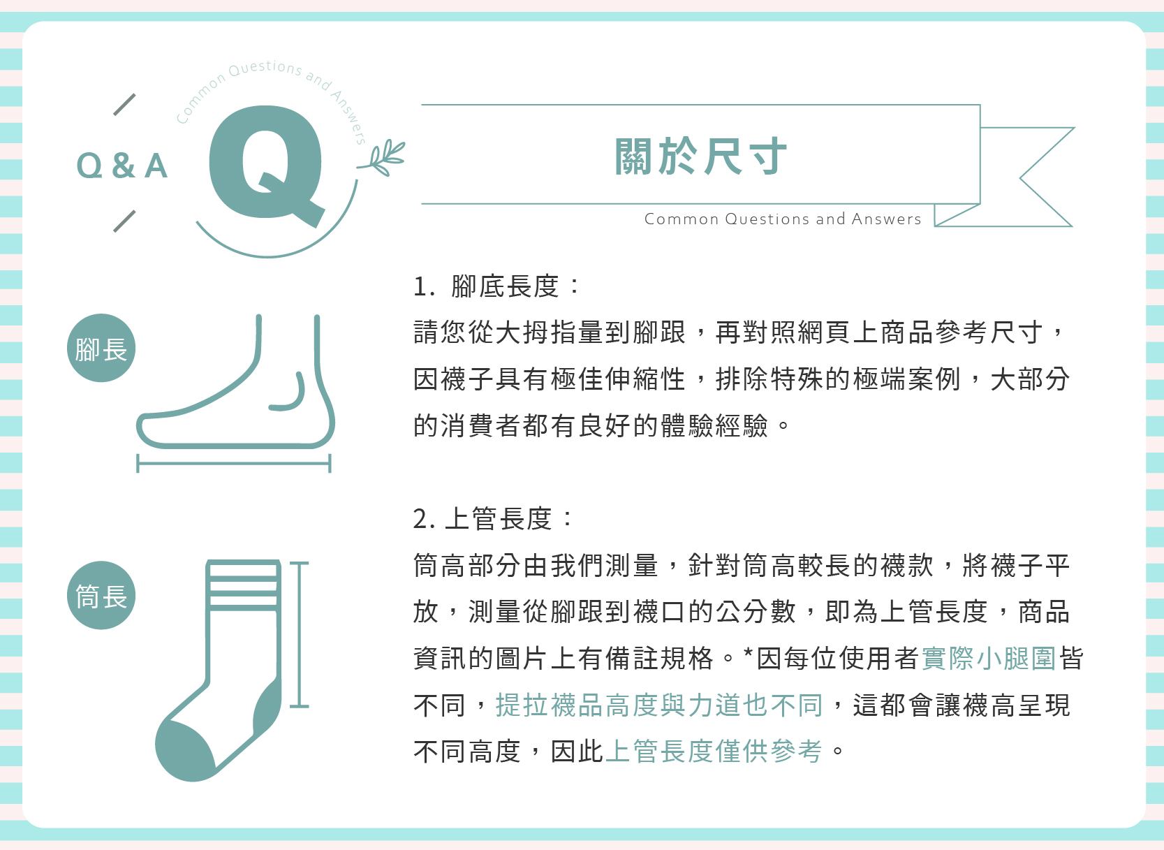 1. 腳底長度:請您從大拇指量到腳跟,再對照網頁上商品參考尺寸,因襪子具有極佳伸縮性,排除特殊的極端案例,大部分的消費者都有良好的體驗經驗。