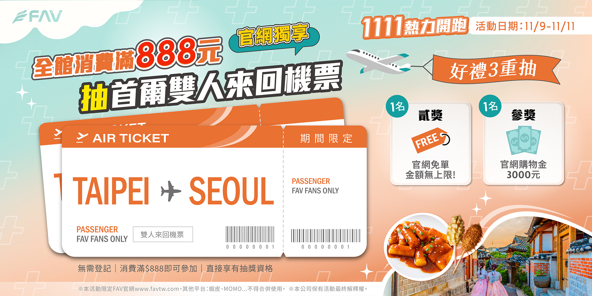 三、抽獎贈品為首爾雙人來回機票共1名、官網購物金新台幣3000元共1名、活動期間之訂單整單免費共1名。每筆訂單僅限中獎一次,活動贈品總計3名中獎者。