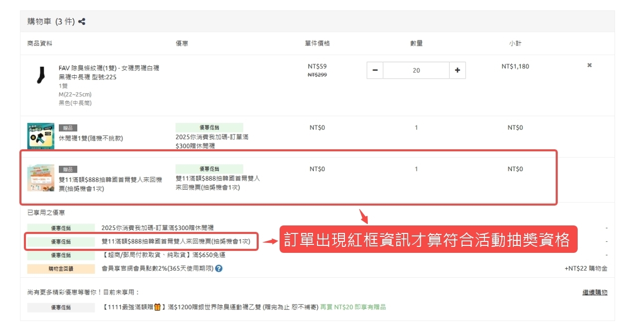 三、抽獎贈品為首爾雙人來回機票共1名、官網購物金新台幣3000元共1名(購物金須於發送後180天內使用完畢)、活動期間之訂單整單免費共1名。每筆訂單僅限中獎一次,活動贈品總計3名中獎者。
