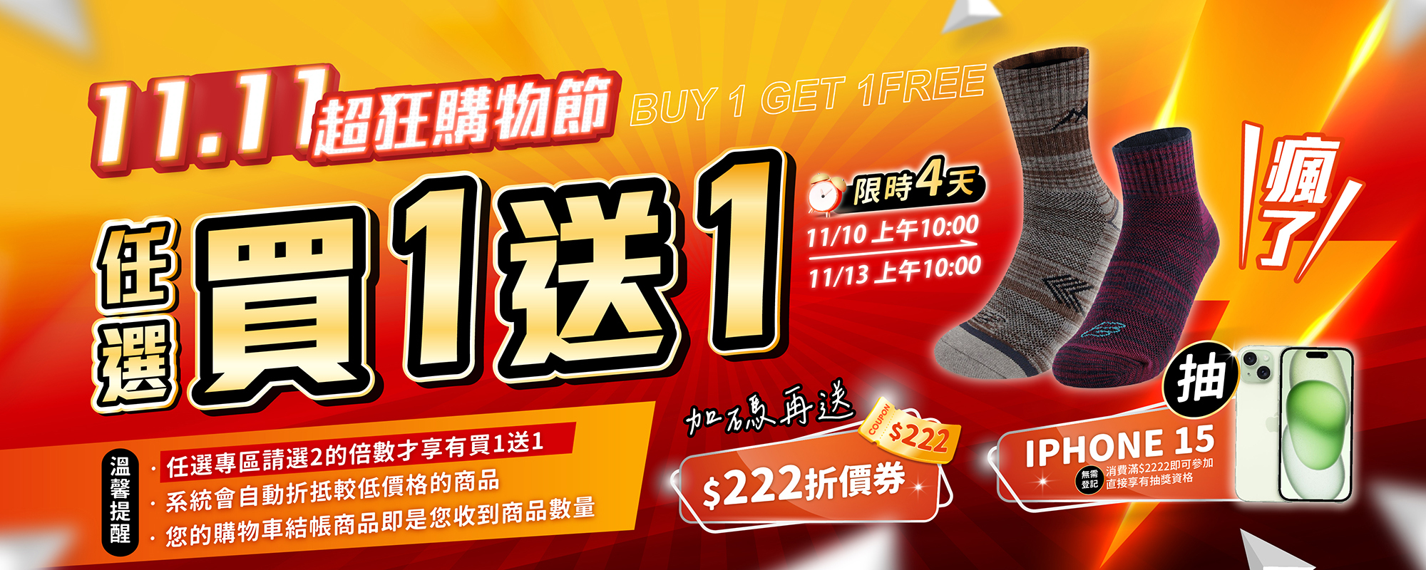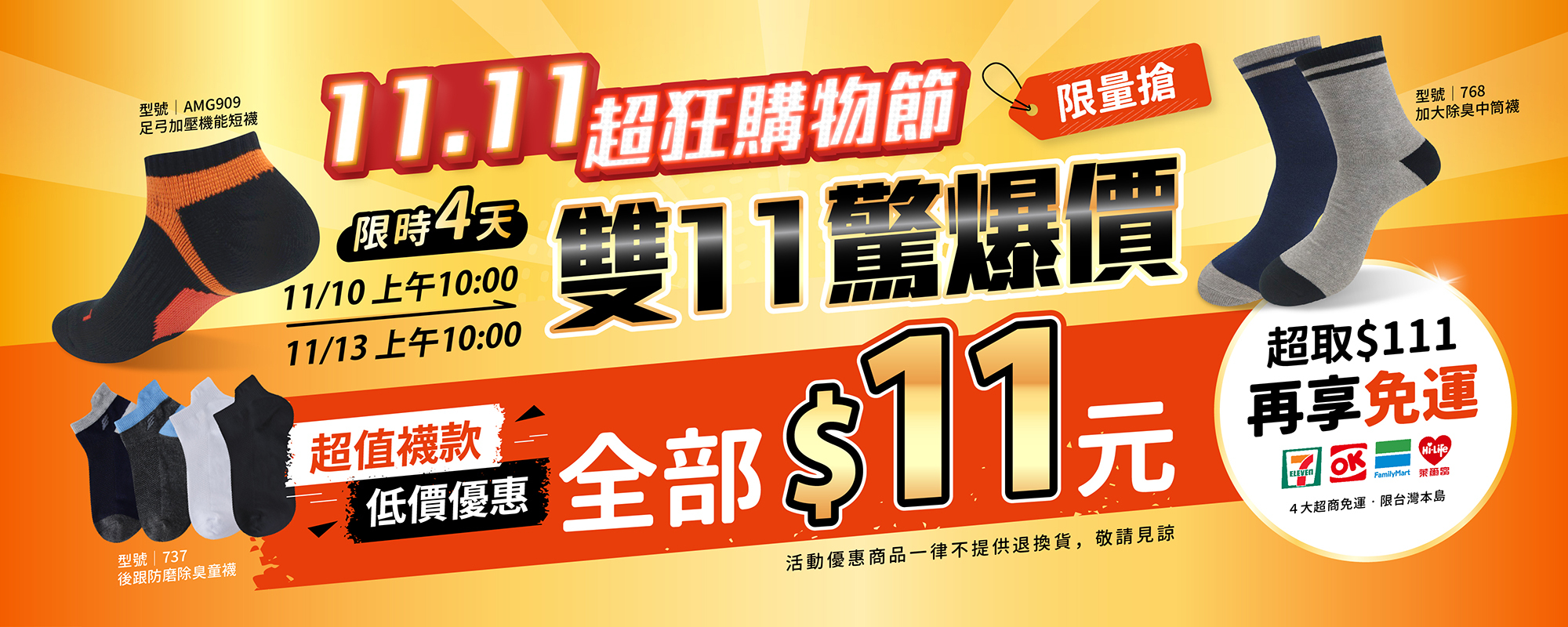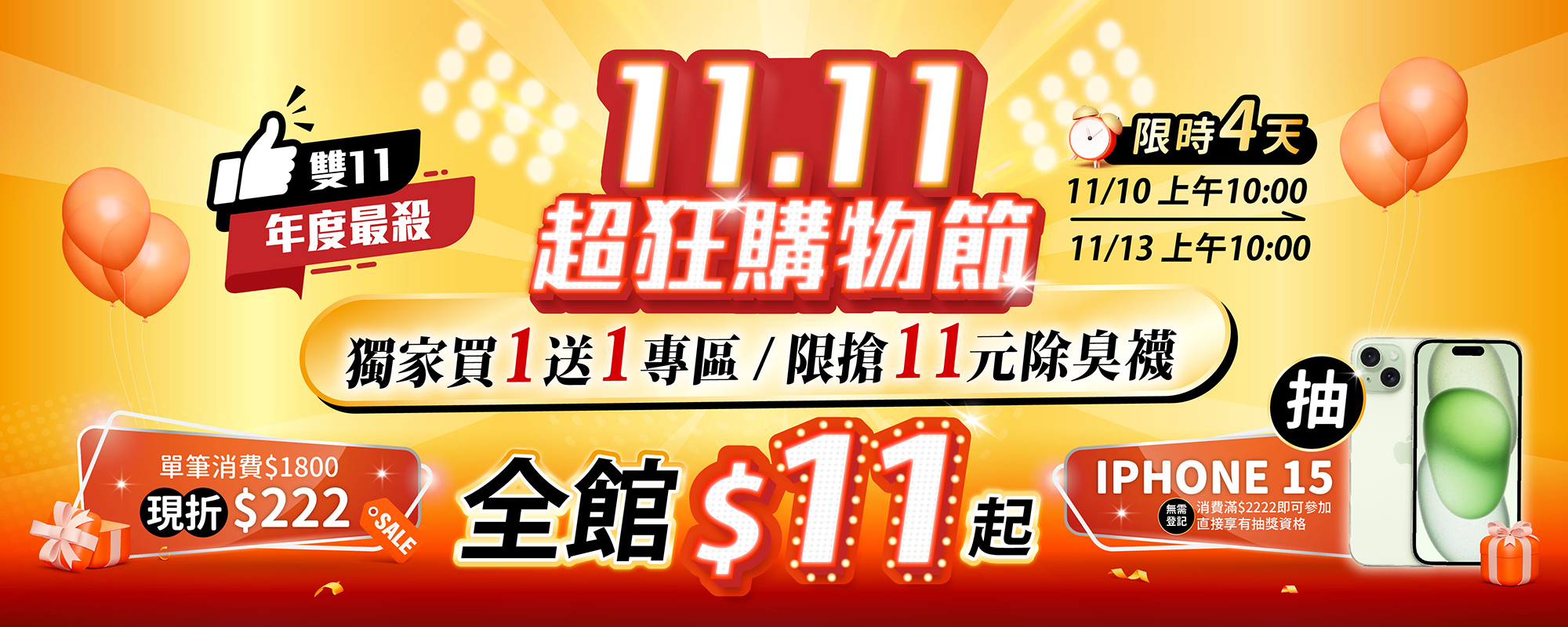 雙11加碼🔥滿$1111現折$111🚩滿額650免運👉滿300再多送一雙!