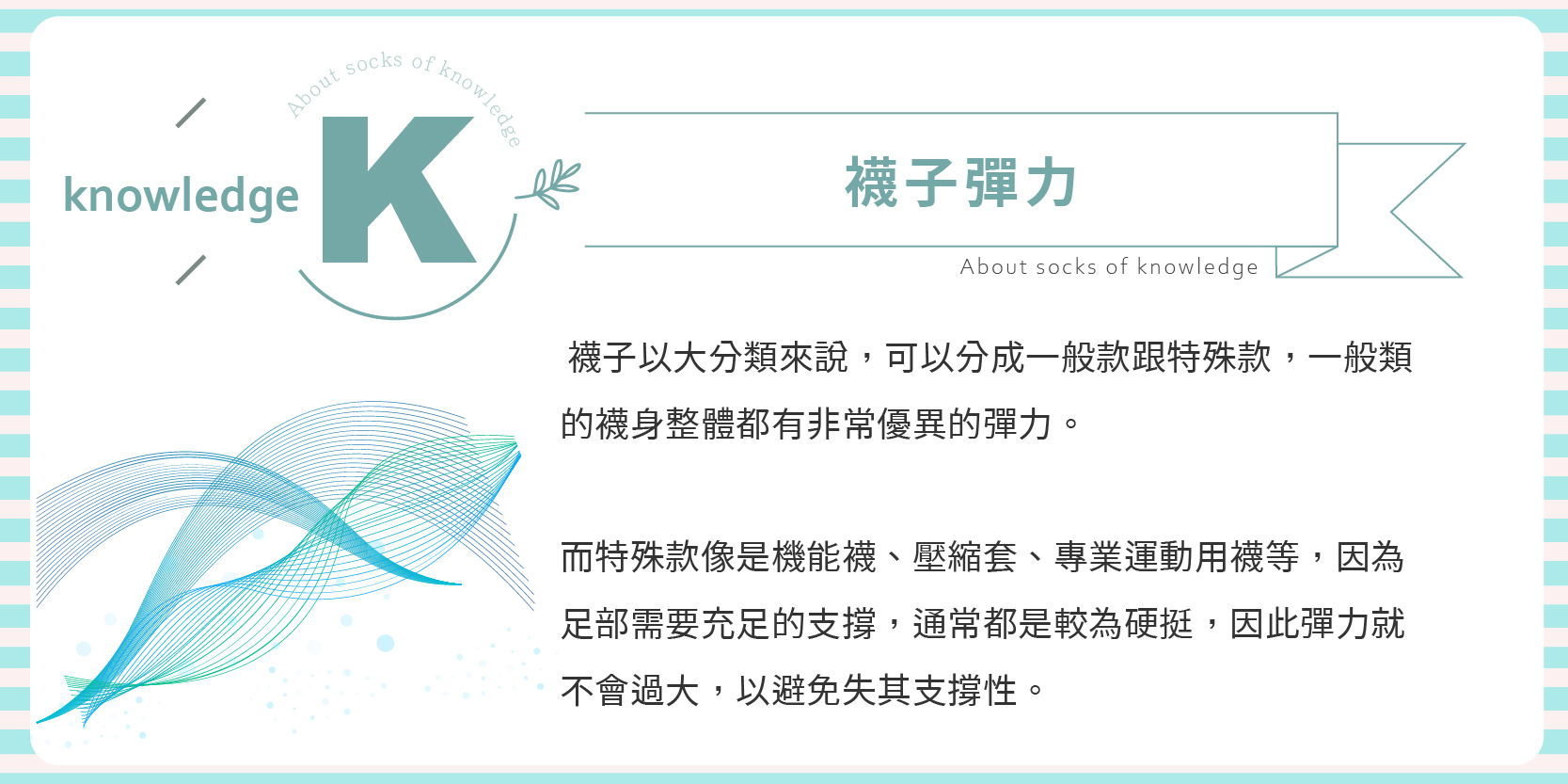 襪子以大分類來說,可以分成一般款跟特殊款,一般類的襪身整體都有非常優異的彈力。而特殊款像是機能襪、壓縮套、專業運動用襪等,因為足部需要充足的支撐,通常都是較為硬挺,因此彈力就不會過大,以避免失其支撐性。