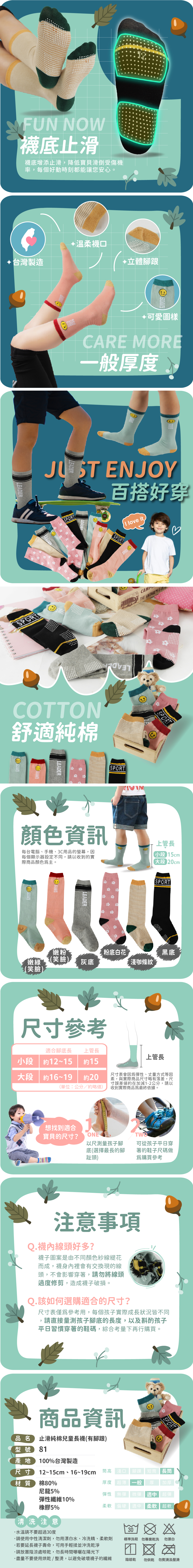 一般厚度,四季可穿。舒適純棉,襪口不緊勒。襪底添加止滑膠,放心讓孩子跑跳。上課、戶外、休閒、娛樂,好穿又好看。